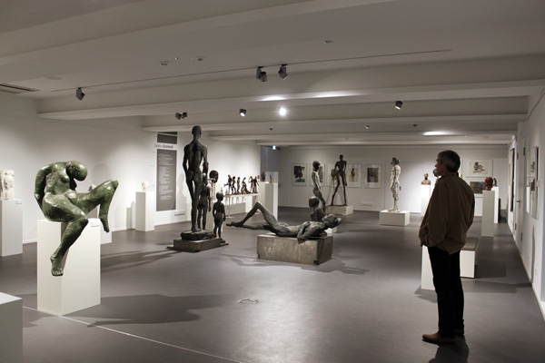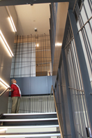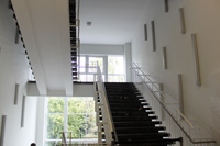 Das Treppenhaus selbst steht skulptural in einem großen Luftraum, verbindet die verschieden-en Ebenen miteinander und öffnet sich in der obersten Etage zum anliegenden Marktplatz. Die Struktur des Geländers untermalt diese Idee, indem die Sicht auf dem Zwischenpodest durch eine vertikale Stabkonstruktion eingeschränkt wird.