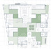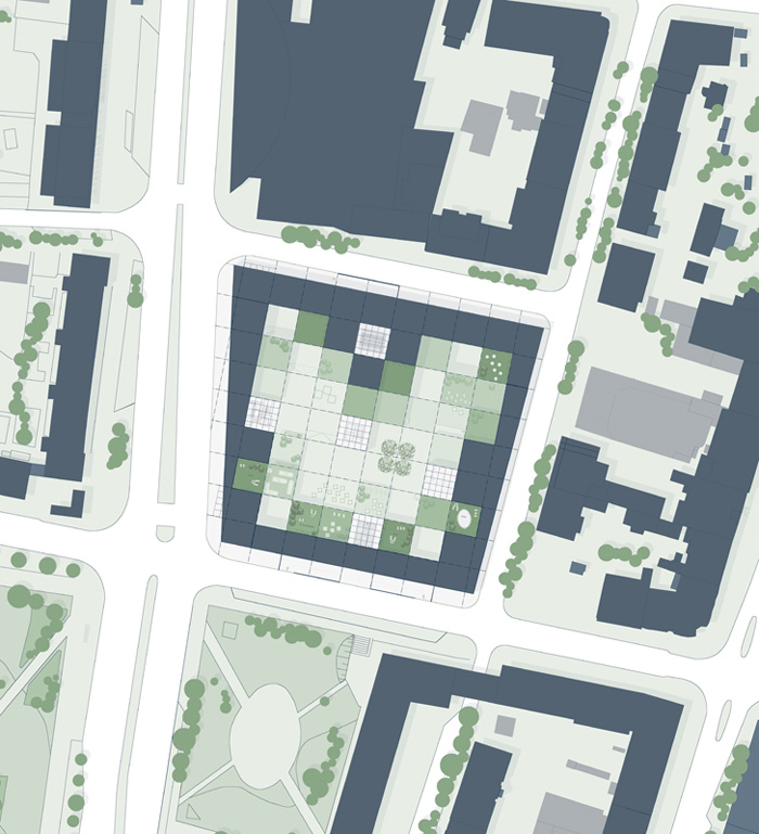Legt man das Raster über das Volumen, teilt sich der Körper auf. Durch vertikale Verschiebung der einzelnen Volumen entstehen verschiedene Plätze, die in unterschiedlichen Höhen in Bezug zueinander stehen und an der diagonalen Erschlißung entlang führen.