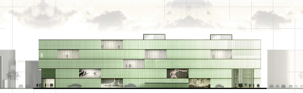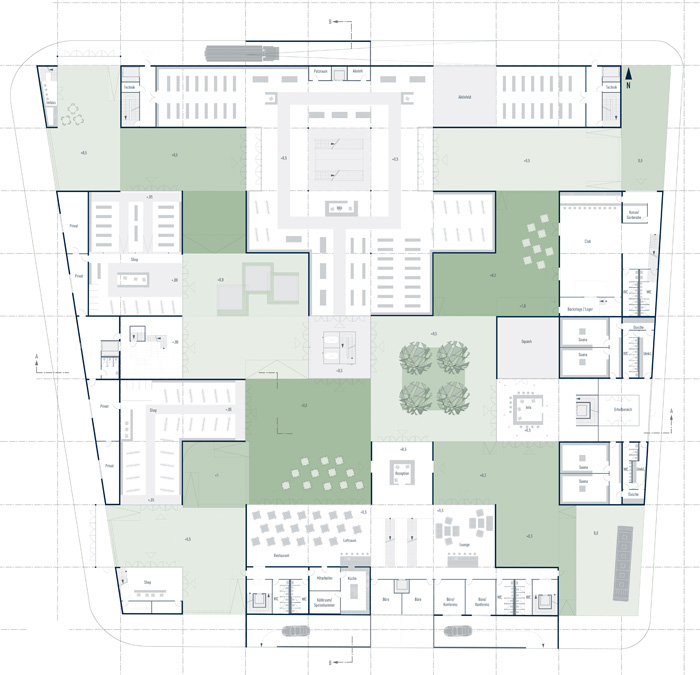 Sport definiert sich in vielerlei Hinsicht und ist sehr umfangreich, dennoch unterliegt jede Sportart bestimmten Regeln Diese Tatsache wird architektonisch in ein Raster umgewandelt. Es entsteht eine Regel des Grundstücks: das Raster.