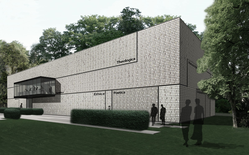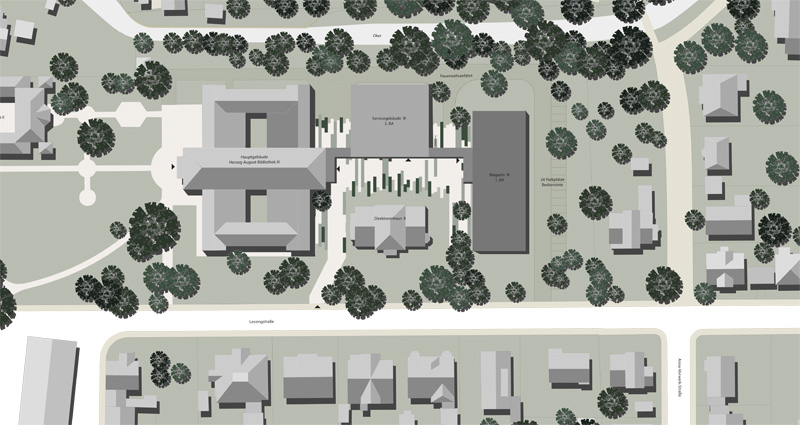 Es wird eine neue Hofsituation geschaffen, bestehend aus dem Neubau des Magazingebäudes und des Servicegebäudes und den Bestandsgebäuden der Bibliothek und des Direktoren-hauses. Der Verbindungsgang zwischen Bibliothek, Servicegebäude und Magazin bildet eine schützende Klammer um das Direktorenhaus und hält einen respektvollen Abstand. Basierend auf der Idee der berühmten alten, 1890 abgerissenen Bibliothek, die unter Leibniz 1705 entstand, sollten die Bücher wieder architektonisch zur Geltung gebracht werden. Heller, stehender Klinker, dunkel verfugt, symbolisiert die pergamentgebundene Büchersammlung des Herzog- August. Die Klinker werden in der Fassade in unterschiedlich große Felder gegliedert analog der Gliederung des Buchbestandes in 20 verschiedene Sachgruppen.