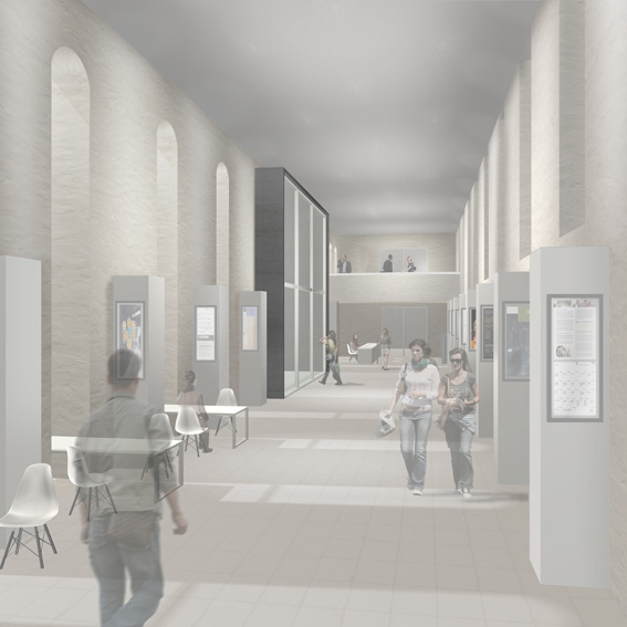 Um einen großzügigen Foyerbereich und gleichzeitig eine eindeutige Orientierung zu schaffen, wurde die Decke zwischen UG und EG im Bestandsgebäude entfernt.