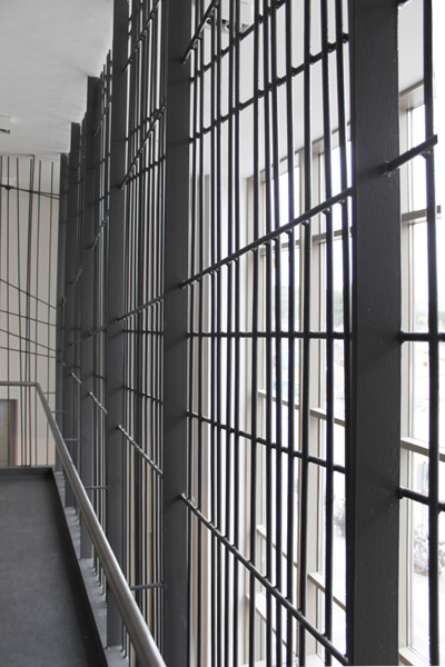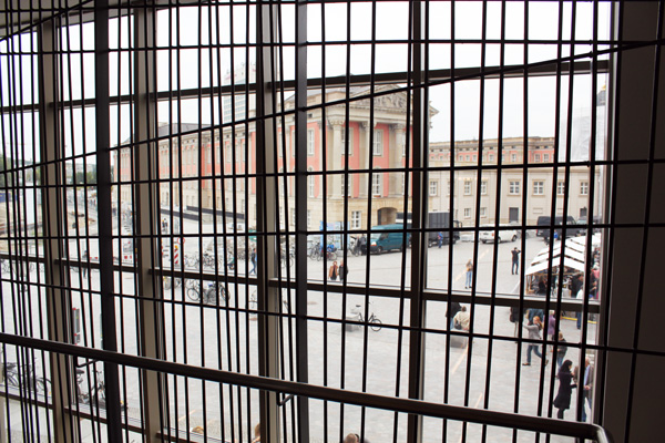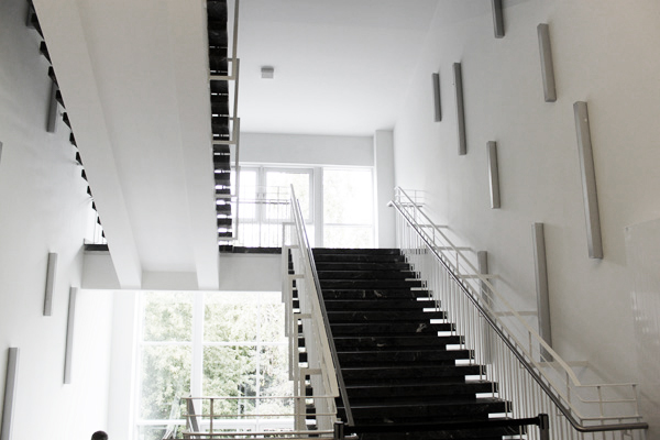 Das Treppenhaus selbst steht skulptural in einem großen Luftraum, verbindet die verschieden-en Ebenen miteinander und öffnet sich in der obersten Etage zum anliegenden Marktplatz. Die Struktur des Geländers untermalt diese Idee, indem die Sicht auf dem Zwischenpodest durch eine vertikale Stabkonstruktion eingeschränkt wird.
