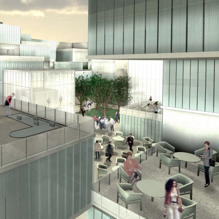 Legt man das Raster über das Volumen, teilt sich der Körper auf. Durch vertikale Verschiebung der einzelnen Volumen entstehen verschiedene Plätze, die in unterschiedlichen Höhen in Bezug zueinander stehen und an der diagonalen Erschlißung entlang führen.