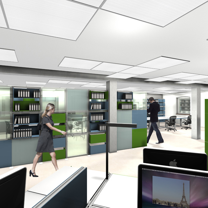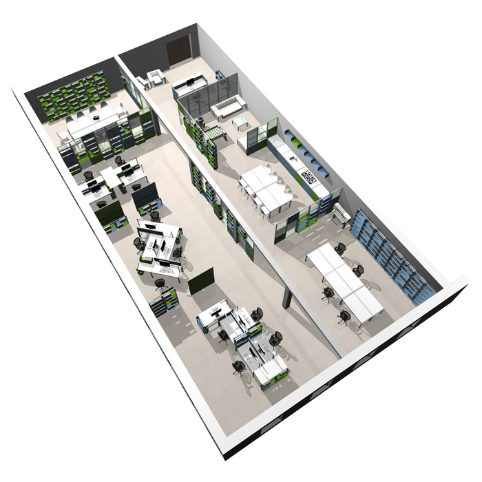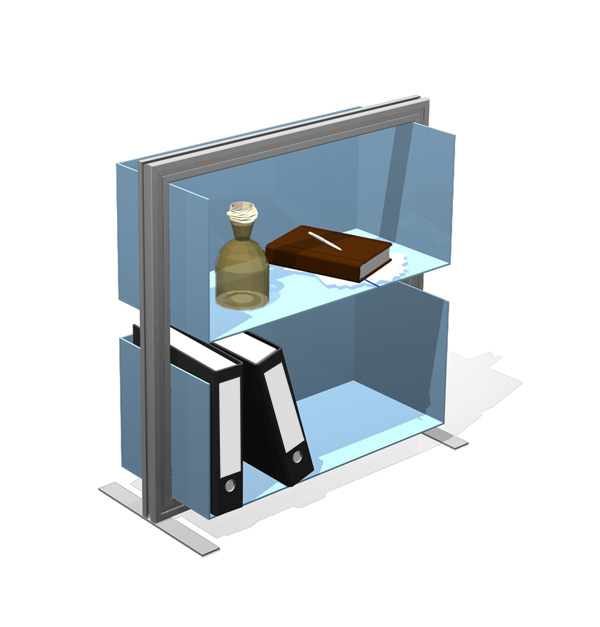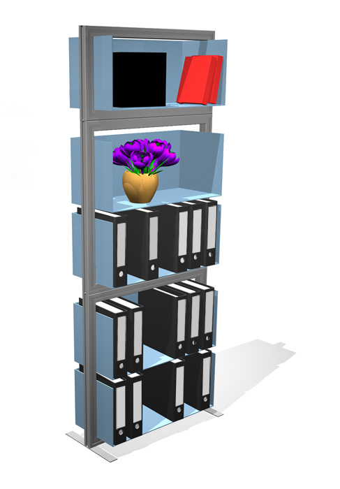 Ein modulares System aus einzelnen Komponenten, die an ein Baukastensystem erinnern, ermöglicht es, den eigenen Arbeitsplatz jederzeit ohne großen Aufwand (werkzeuglos) an die jeweiligen Bedürfnisse des Mitarbeiters und an die Anforderungen an das Planungsteam anzupassen.Um den Aufwand möglichst gering, die Varianten aber möglichst zahlreich zu halten, gibt es lediglich 2 Grundrahmenraster mit 4 verschiedenen Blenden und ein Regalkastensystem, das ebenfalls in die Rahmen eingefügt werden kann. Ein wichtiger Grundgedanke bleibt hierbei der offene Arbeitsraum, der zugleich Rückzugsmöglichkeiten und individuelle Gestaltung zulässt.